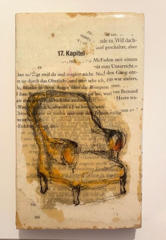 Armchair, ist eine Handzeichnung und wurde auf einer alten Buchseite erstellt und sorgfältig auf Holz aufgebracht. Eine feine Schicht Kunstharz versiegelt das Motiv und verleiht ihm eine feste und interessante Oberfläche.